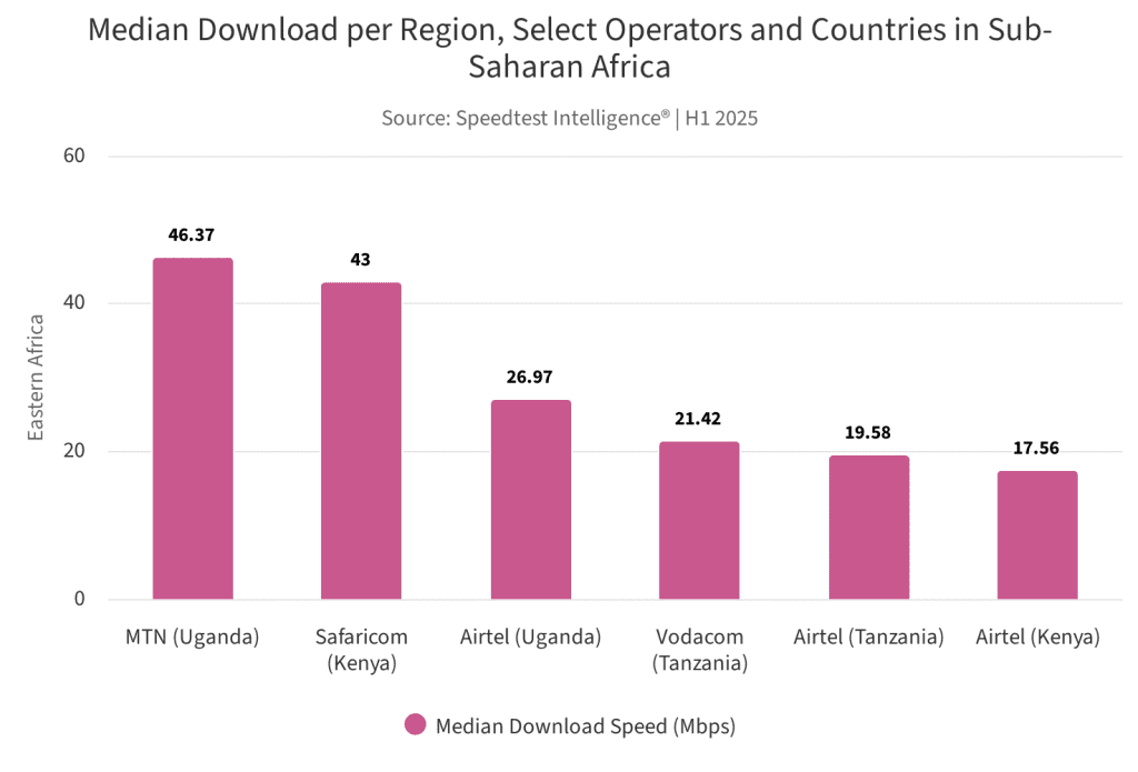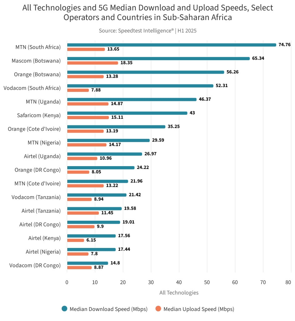 Ookla’s latest report paints a familiar story in new figures. Across sub-Saharan Africa, median download speeds are creeping higher — MTN South Africa hitting 74.76 Mbps, Vodacom claiming 5G median speeds of 174.9 Mbps — and Safaricom in Kenya showing 183 Mbps on 5G. On paper, operators are racing ahead. Look closer, though, and the sprint has a few trips, stumbles, and flat tyres along the way.